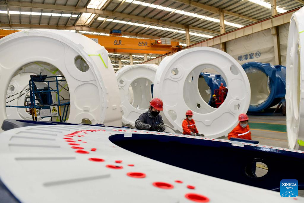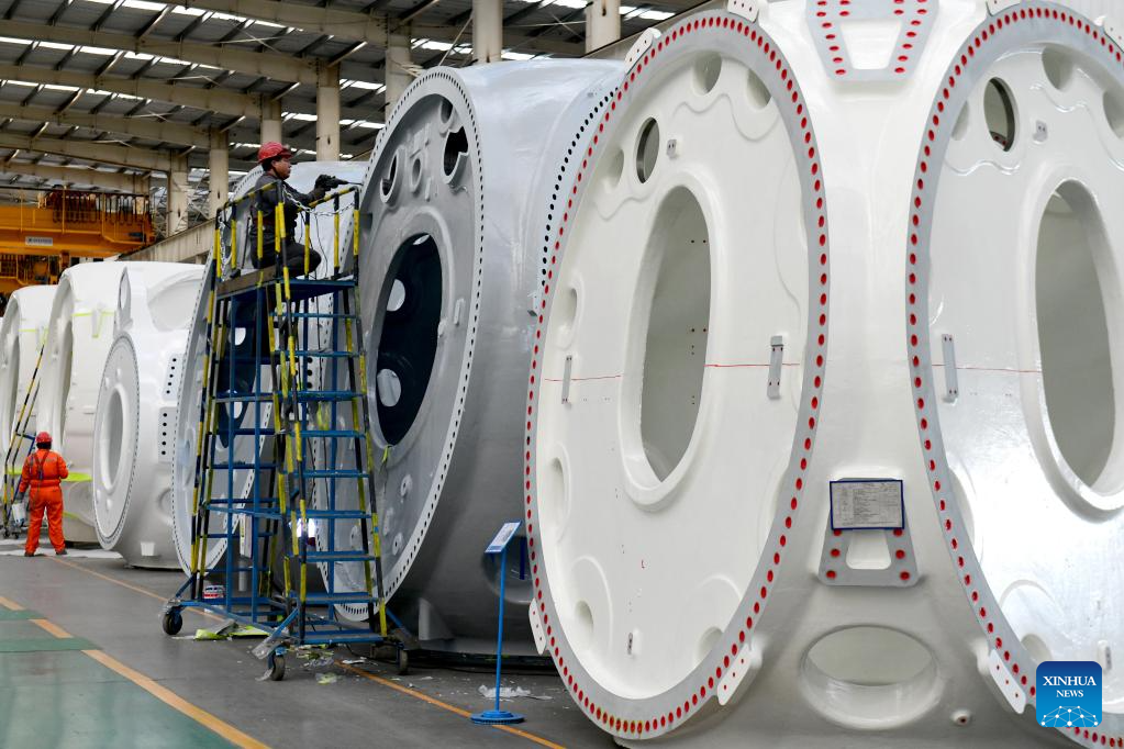 Workers paint hubs of wind power generators at a painting workshop of the wind power equipment manufacturing industrial park in Huimin County, east China's Shandong Province, Nov. 19, 2025. In 2020, China announced that it would strive to reach peak carbon dioxide emissions before 2030 and carbon neutrality before 2060. (Xinhua/Guo Xulei)