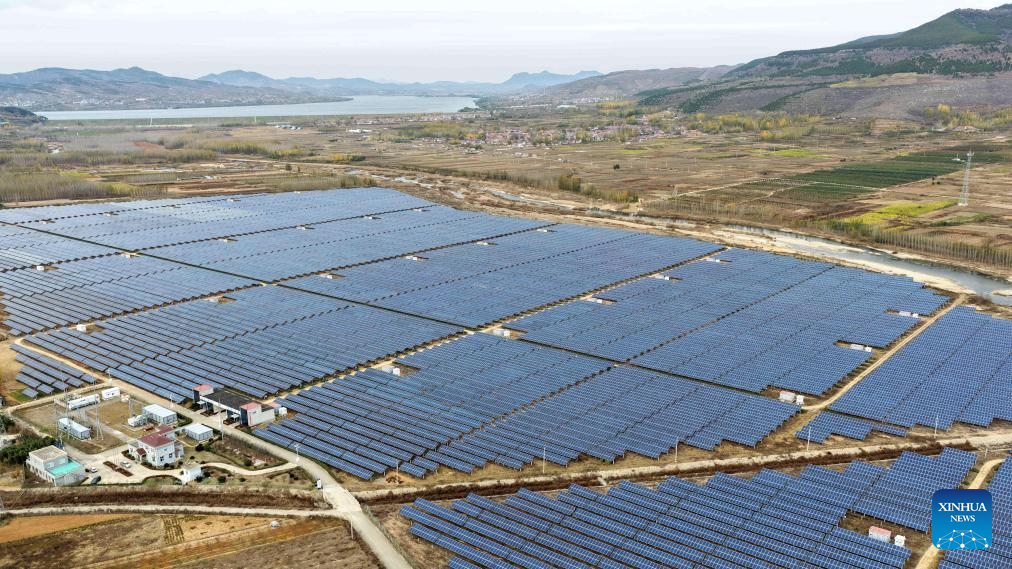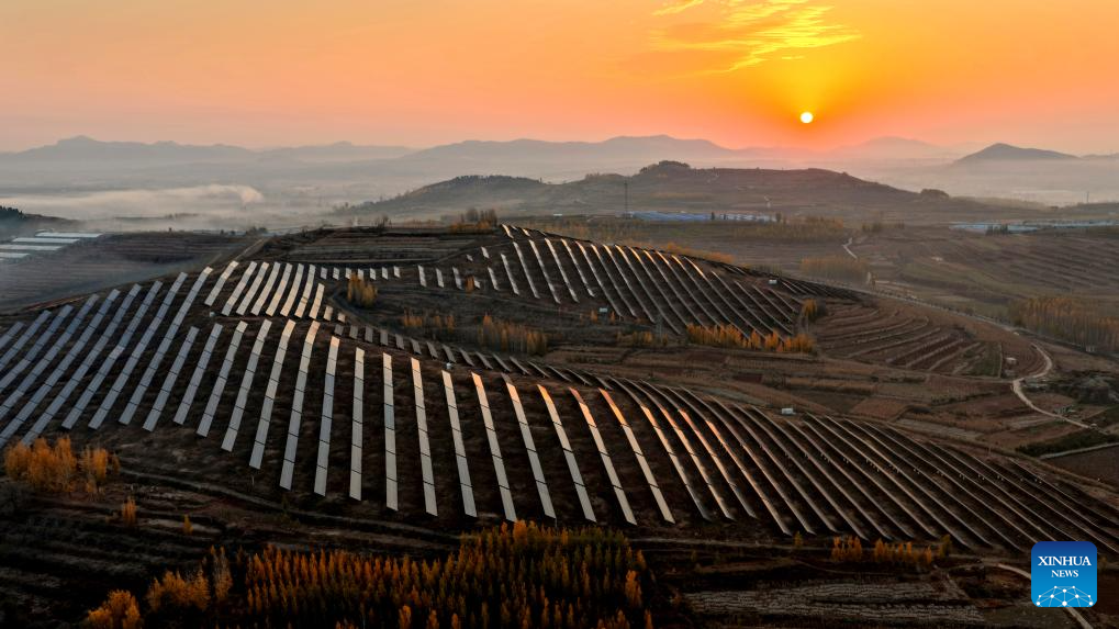 An aerial drone photo taken on Nov. 17, 2025 shows a photovoltaic power generation project at Andi Township of Yinan County in Linyi City, east China's Shandong Province. In 2020, China announced that it would strive to reach peak carbon dioxide emissions before 2030 and carbon neutrality before 2060. (Photo by Wang Yanbing/Xinhua)