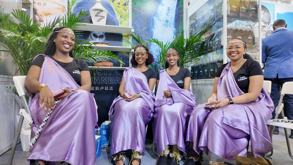 Young women from Rwanda make an appearance in traditional attire, showcasing the country's culture and products during the 8th China International Import Expo in east China's Shanghai on Nov. 7, 2025. (People's Daily/Michael Oduro)