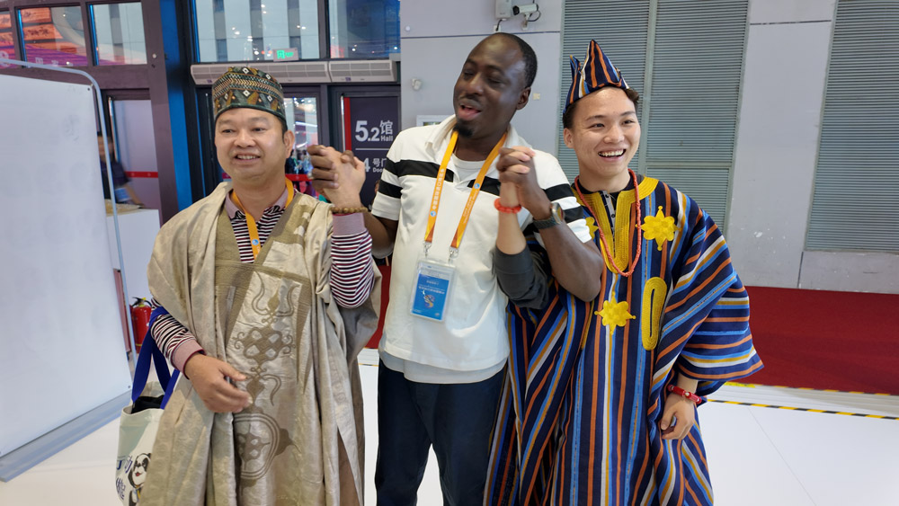 A Nigerian exhibitor poses with Chinese attendees at the Nigeria booth, where visitors try on traditional Nigerian clothing and capture the moment with photos during the 8th China International Import Expo in east China's Shanghai on Nov. 7, 2025. (People's Daily/Michael Oduro)