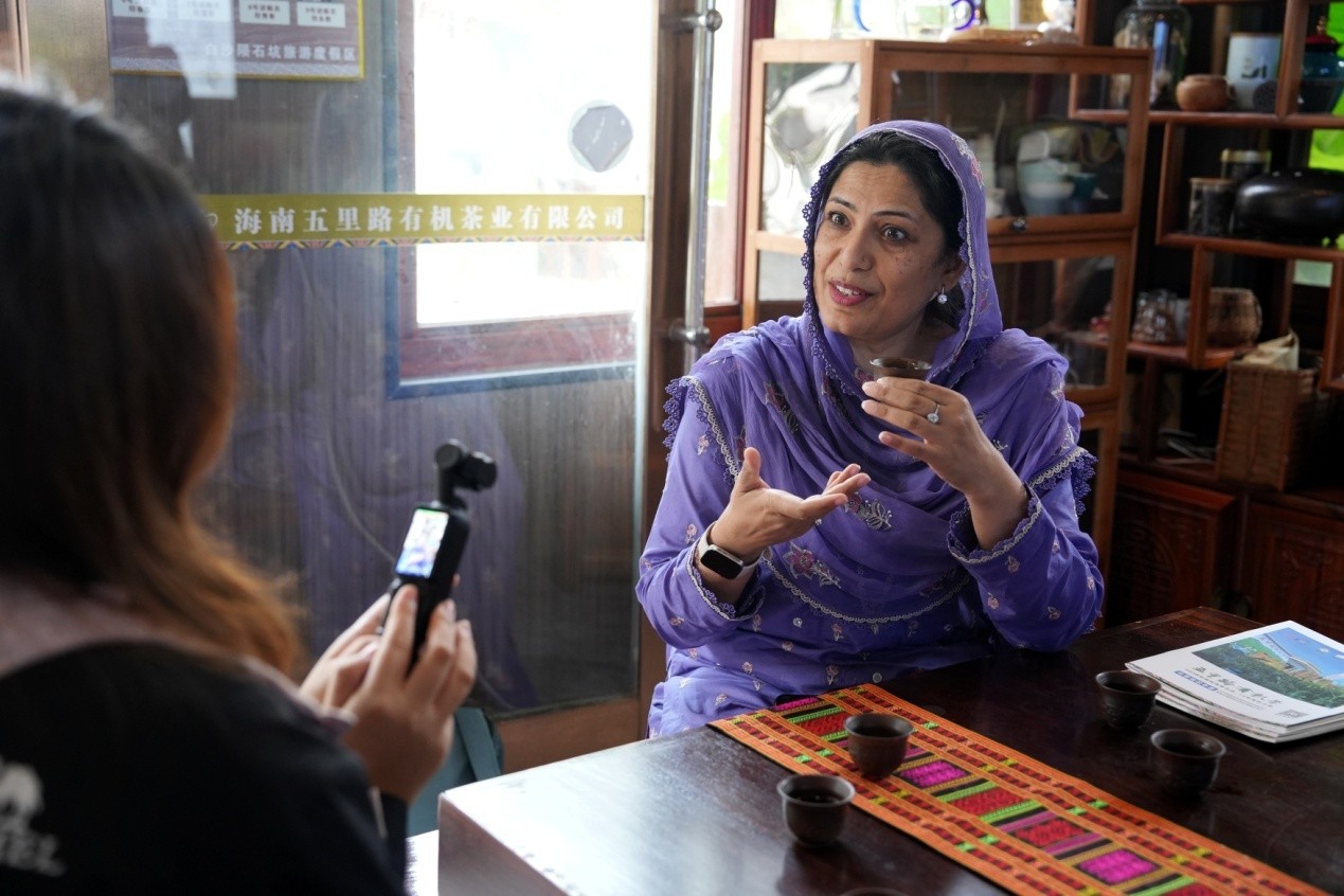 A Pakistani member of the multilingual reporting team from People's Daily Online tastes white tea in Baisha Li Autonomous County, south China's Hainan Province. (People's Daily Online/Fu Wuping)