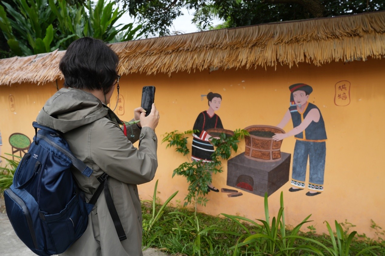 Photo shows a wall painting depicting the tea-making process in Baisha Li Autonomous County, south China's Hainan Province. (People's Daily Online/Fu Wuping)
