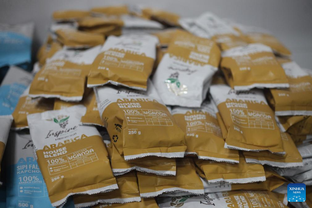 This photo taken on Nov. 29, 2025 shows coffee packages at the African Coffee Park in western Uganda district of Ntungamo. (Photo by Ronald Ssekandi/Xinhua)