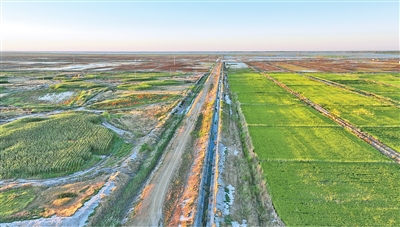 The right section of this photo shows saline-alkali land planted with Manchurian wild rice in Zhenlai county, Baicheng city, northeast China's Jilin Province. (Photo/Pan Shengyu)