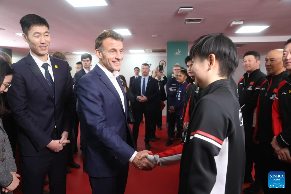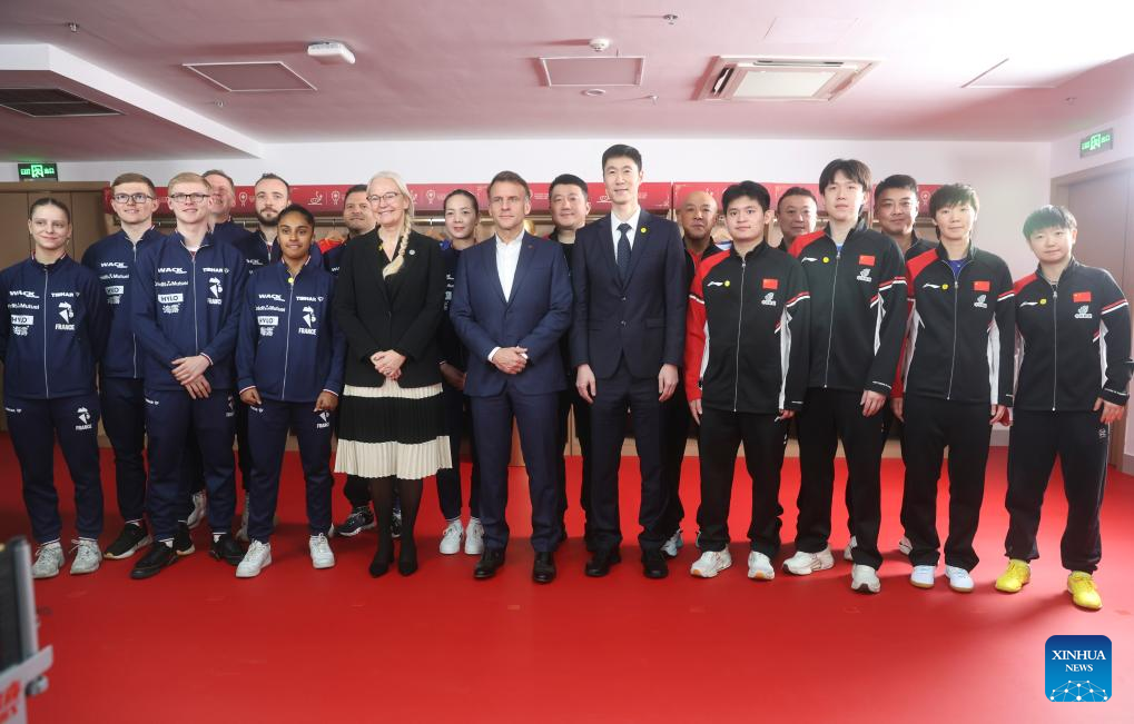 French President Emmanuel Macron meets with Chinese and French table tennis players participating the ITTF Mixed Team World Cup 2025 in Chengdu, southwest China's Sichuan Province, Dec. 5, 2025. (Photo by Liu Yuchen/Xinhua)