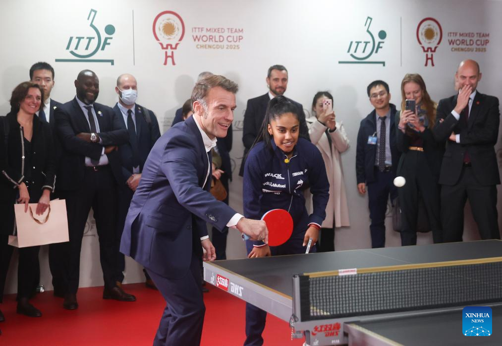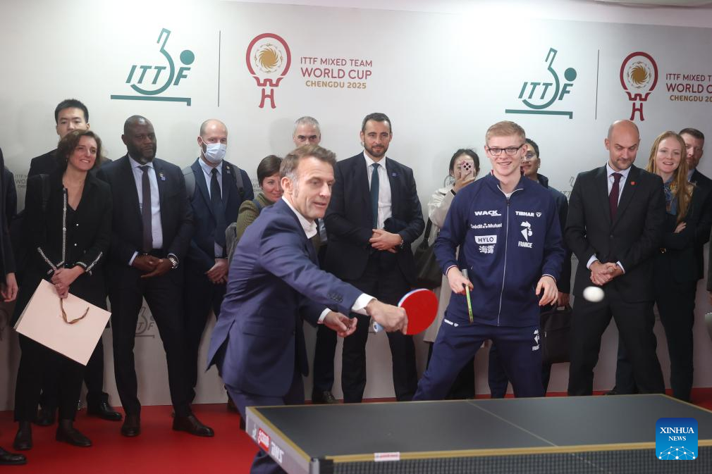 French President Emmanuel Macron plays table tennis during a meeting with Chinese and French table tennis players participating the ITTF Mixed Team World Cup 2025 in Chengdu, southwest China's Sichuan Province, Dec. 5, 2025. (Photo by Liu Yuchen/Xinhua)