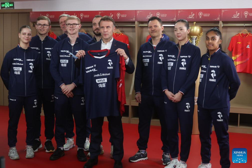 French President Emmanuel Macron receives a jersey from the French team during a meeting with Chinese and French table tennis players participating the ITTF Mixed Team World Cup 2025 in Chengdu, southwest China's Sichuan Province, Dec. 5, 2025. (Photo by Liu Yuchen/Xinhua)
