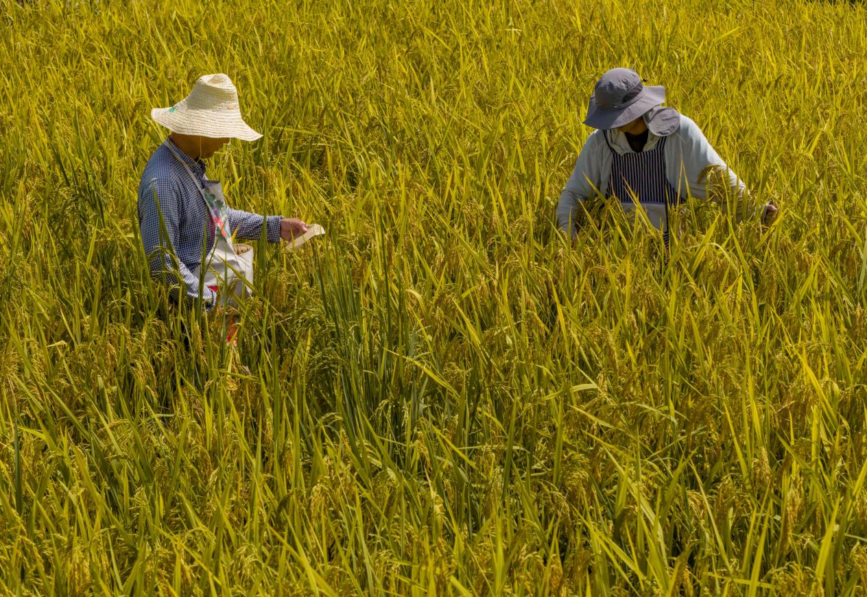 Researchers work in a research base for rice breeding of Sichuan Agricultural University, southwest China's Sichuan province. (Photo/Chen Xianlin)