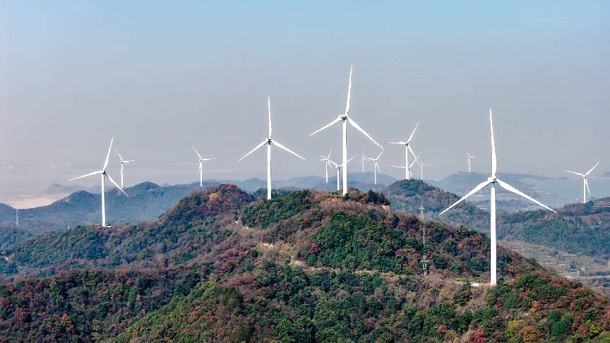 Wind turbines rotate on a mountain ridge in Gaoqiao village, Hukou county, Jiujiang, east China's Jiangxi province. (Photo/Zhang Yu)