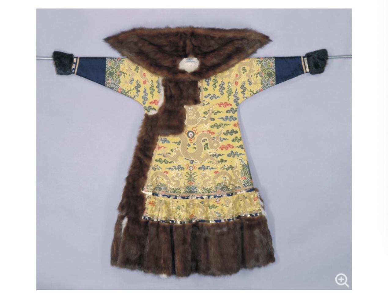 A bright yellow satin court robe with cloud and dragon motifs, trimmed with mink fur. (Screenshot from the Palace Museum official website)
