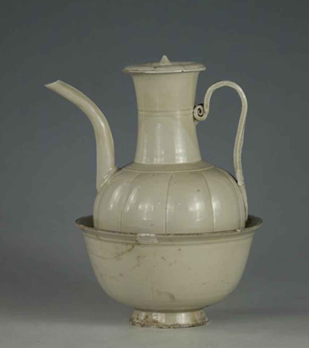 A white-glazed melon-ribbed porcelain wine-warming ewer. (Screenshot from the Datong Museum official website)