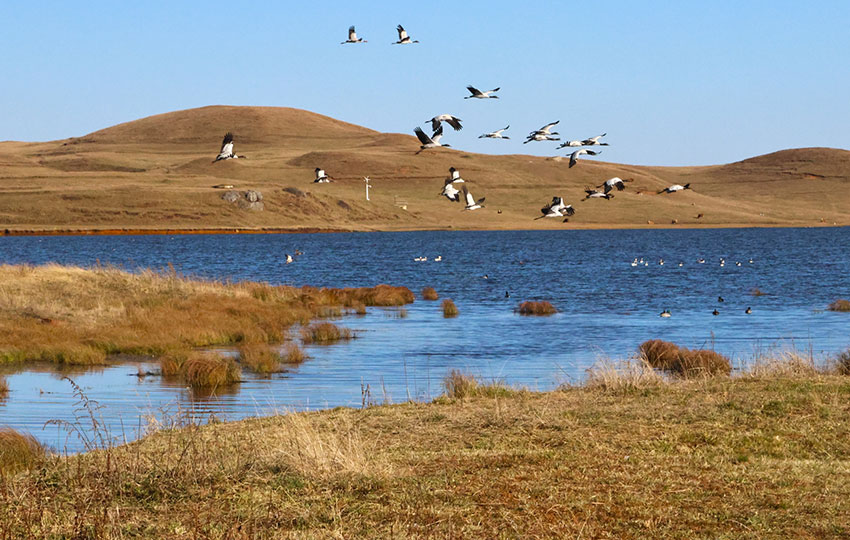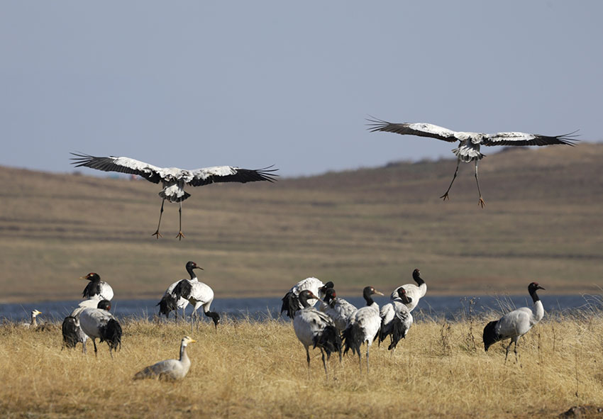 Black-necked cranes fly over the Yunnan Dashanbao National Nature Reserve for Black-necked Cranes in Zhaoyang district, Zhaotong, southwest China's Yunnan Province. (Photo courtesy of the convergence media center of Zhaoyang district)
