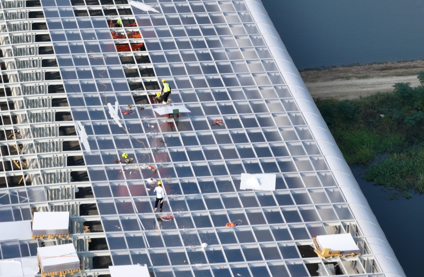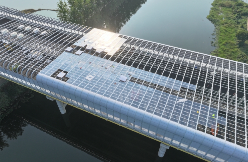 Photo shows an enclosed noise barrier at the construction site of the Shuangliu Yangtze River Bridge in central China's Hubei Province. (Photo/Li Peng)