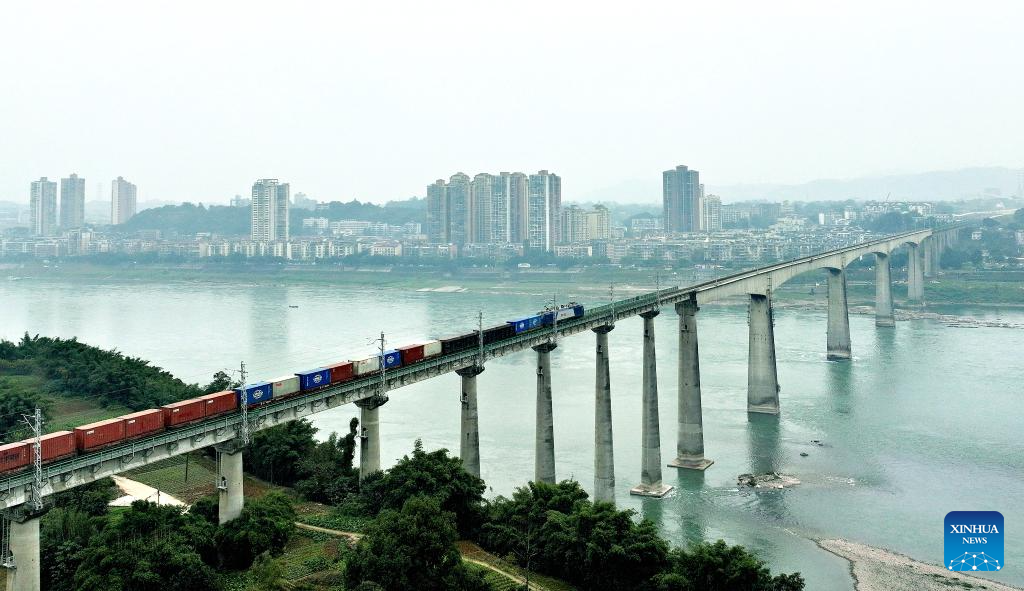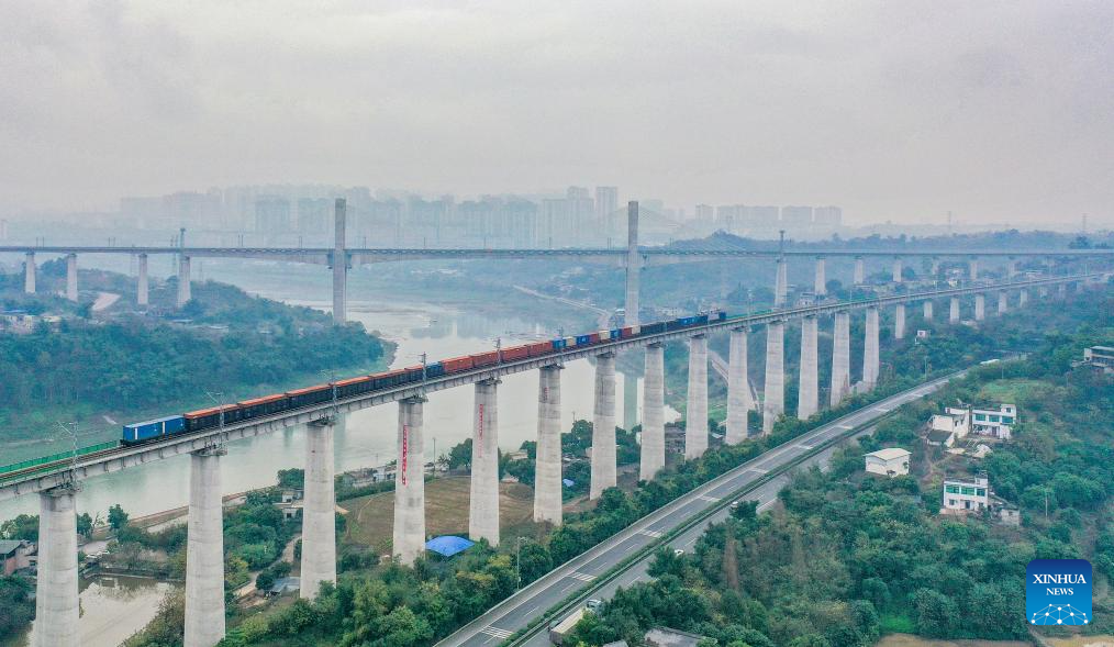 An aerial drone photo taken on Dec. 25, 2025 shows a freight train running on a bridge over the Yangtze River along the Longchang-Luxian-Xuyong railway in Luzhou, southwest China's Sichuan Province. The Longchang-Luxian-Xuyong railway began operation on Thursday as part of China's New International Land-Sea Trade Corridor rail service, which is a crucial logistics link between China's western inland regions and global markets. (Photo by Liao Shengchun/Xinhua)