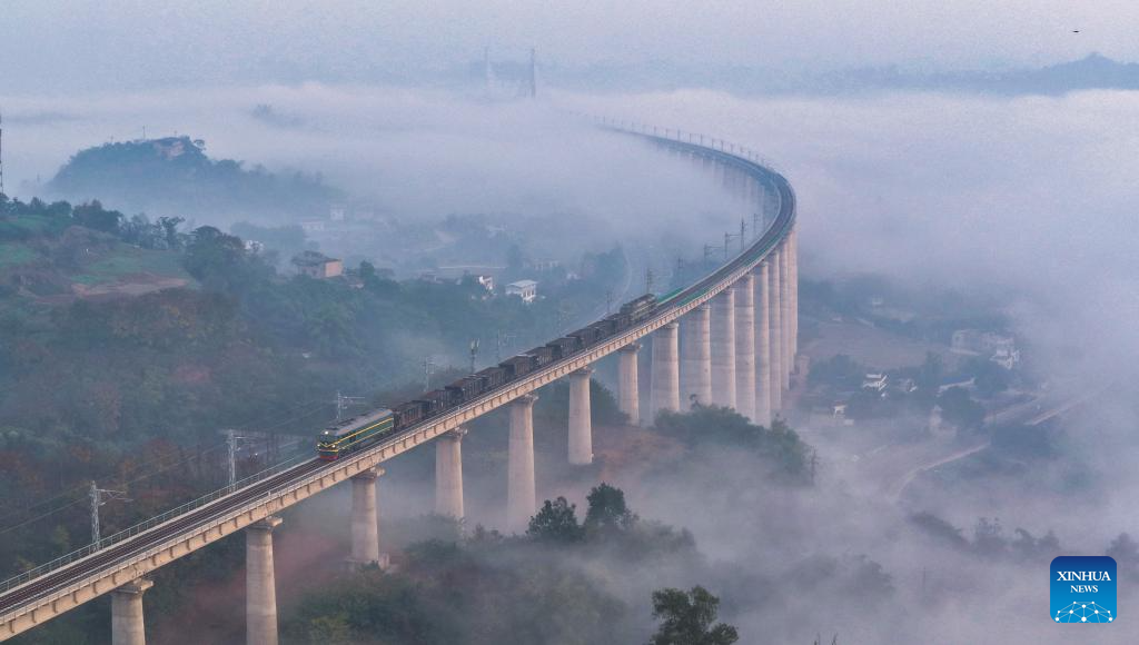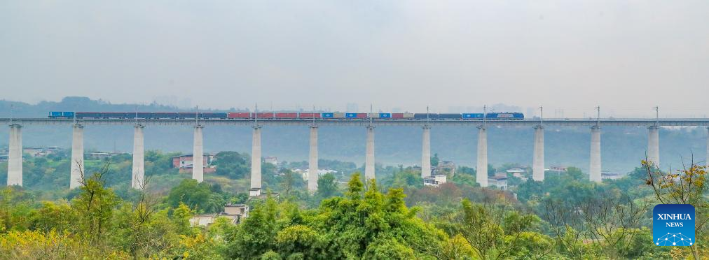 An aerial drone photo taken on Dec. 8, 2025 shows a test train running on the Longchang-Luxian-Xuyong railway in Luzhou, southwest China's Sichuan Province. The Longchang-Luxian-Xuyong railway began operation on Thursday as part of China's New International Land-Sea Trade Corridor rail service, which is a crucial logistics link between China's western inland regions and global markets. (Photo by Liu Xueyi/Xinhua)