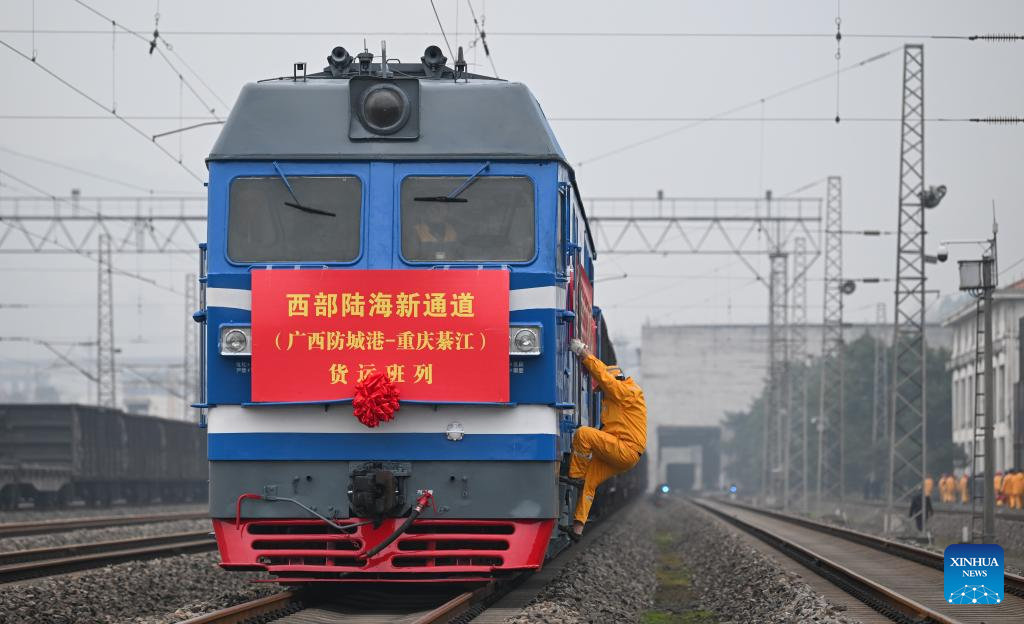 This photo taken on Dec. 29, 2025 shows the first freight train from Fangchenggang City of Guangxi to Qijiang District of Chongqing arriving at the Qijiang North railway station in southwest China's Chongqing Municipality. The first freight train of the Guangxi Fangchenggang-Chongqing Qijiang railway, part of China's New International Land-Sea Trade Corridor rail service which is a crucial logistics link between China's western inland regions and global markets, arrived at the Qijiang North railway station in Chongqing on Monday. (Xinhua/Chen Cheng)