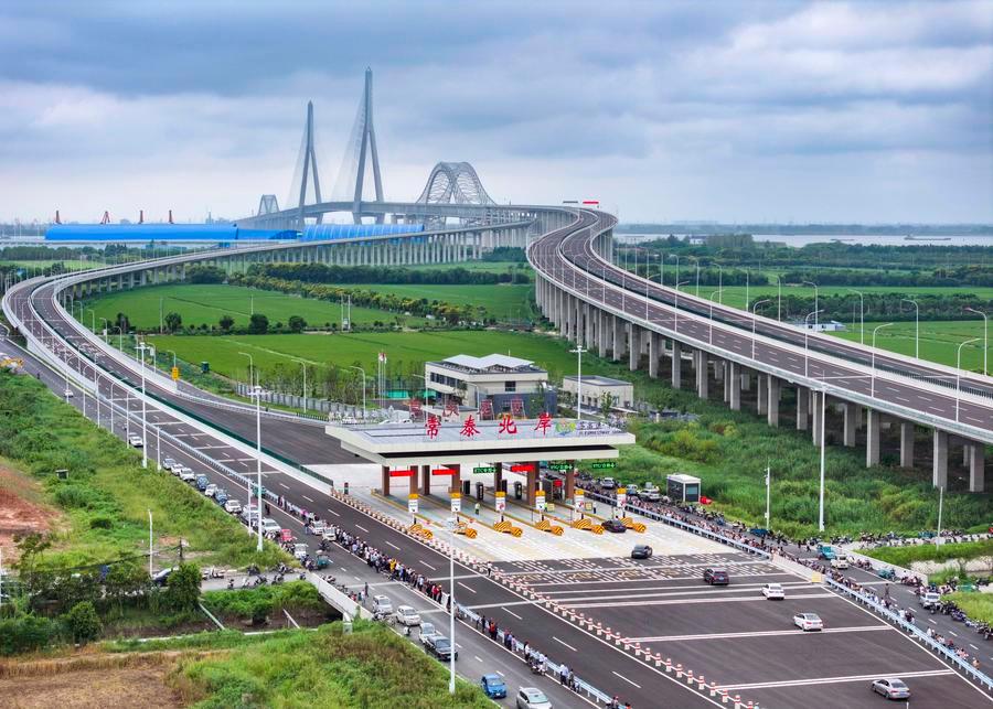 An aerial drone photo taken on Sept. 9, 2025 shows vehicles passing a toll gate of the Changtai Yangtze River Bridge, seen from the north bank of the Yangtze River, in east China's Jiangsu Province. (Photo by Gu Jihong/Xinhua)