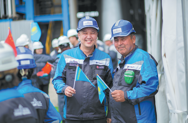 Chinese workers are pictured at the inauguration ceremony for the upgrade project of the Caspian Asphalt Plant in Aktau, Kazakhstan, on May 5.This expansion will ease Kazakhstan's shortage of road asphalt for infrastructure development. Photo/Xinhua