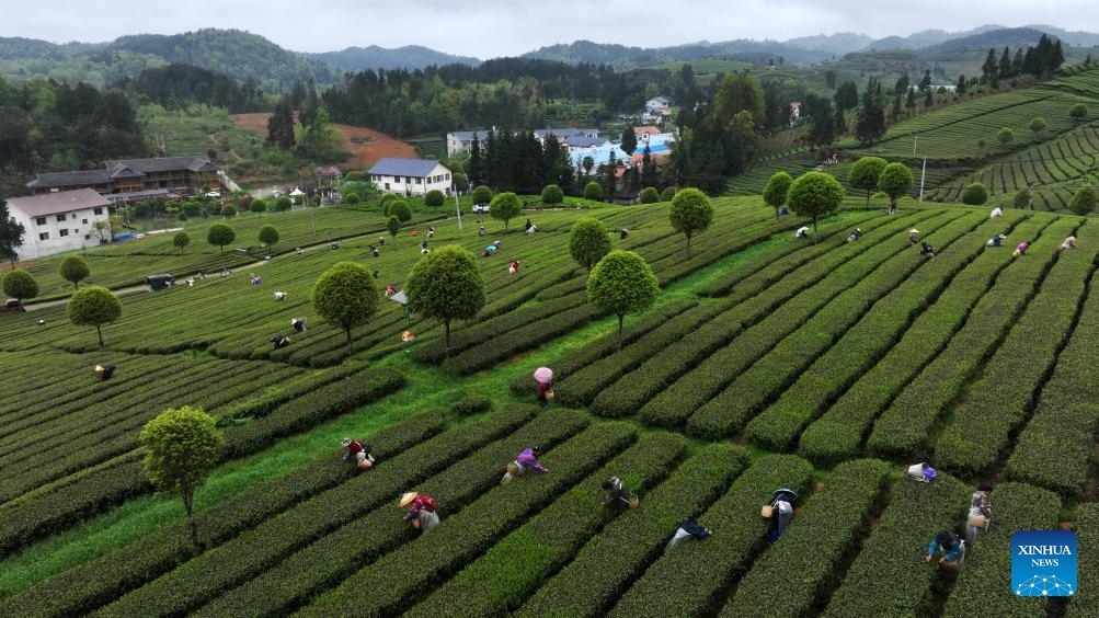 A drone photo shows farmers picking tea leaves at tea gardens in Erlong village in Yuqing county, southwest China's Guizhou Province, April 5, 2024. (Xinhua/Yang Ying)