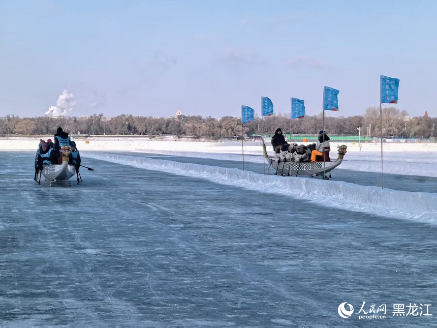 People take part in a dragon boat race on ice in Harbin, northeast China's Heilongjiang Province. (People's Daily Online/Zhang Qi)