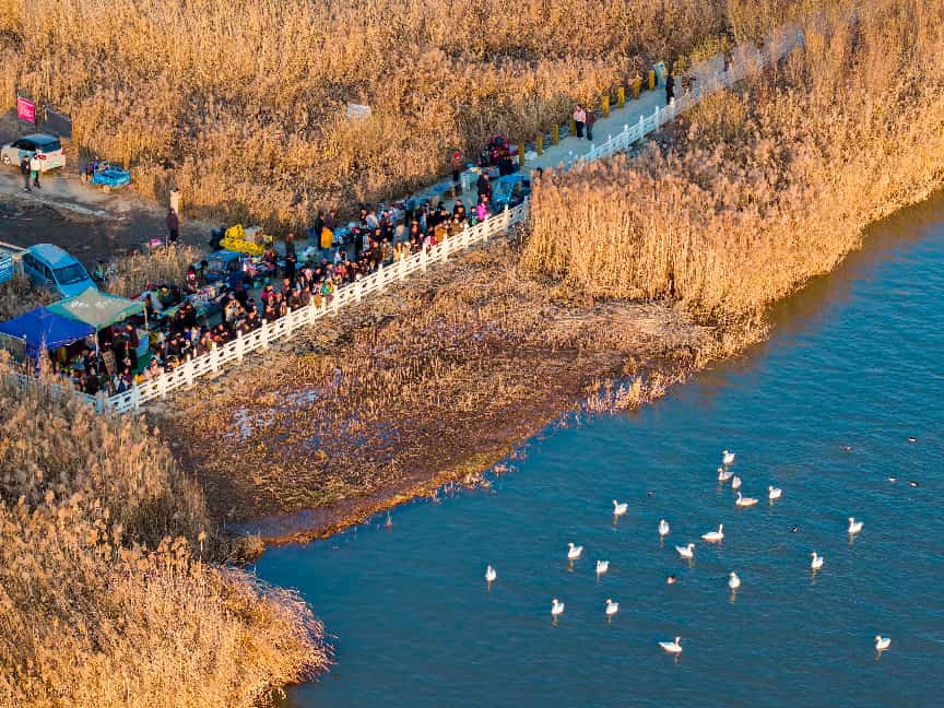 Tourists watch swans at a wetland in Dachuan township, Xigu district, Lanzhou, northwest China's Gansu province, Dec. 7, 2025. (Photo/Wang Hong)