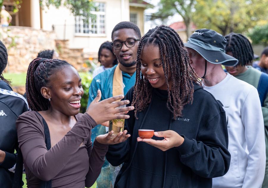 Students taste Chinese tea during an event celebrating the upcoming International Chinese Language Day at the Confucius Institute at the University of Johannesburg in Johannesburg, South Africa, April 17, 2025. (Xinhua/Zhang Yudong)