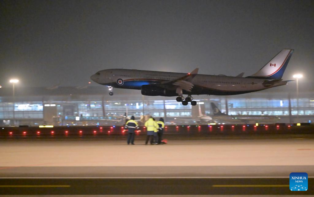 The plane carrying Canadian Prime Minister Mark Carney arrives in Beijing, capital of China, Jan. 14, 2026. Carney arrived here on Wednesday for an official visit to China through Saturday. (Xinhua/Cai Yang)