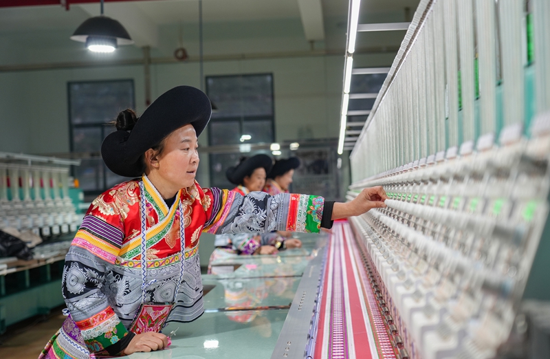 Embroiderers test embroidery machines at a wax printing and embroidery cooperative in Zhuchang township, Nayong county, Bijie city, southwest China's Guizhou Province, on Jan. 5, 2026. (Photo/Yang Ying)