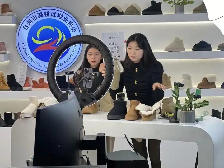 In a livestream studio at a shared workshop in Shangni village, Luqiao district, Taizhou, a host holds a pair of snow boots, recommending them to viewers during a livestreaming session. The number of orders keeps ticking up.