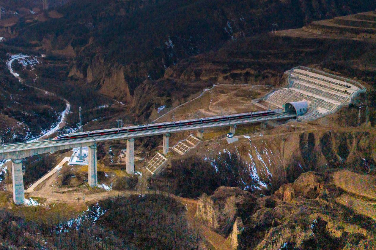 A Fuxing bullet train runs along the Luochuan-Fuxian section of the Xi'an–Yan'an High-Speed Railway, Dec. 26, 2025. (Photo/Liu Yijiang)