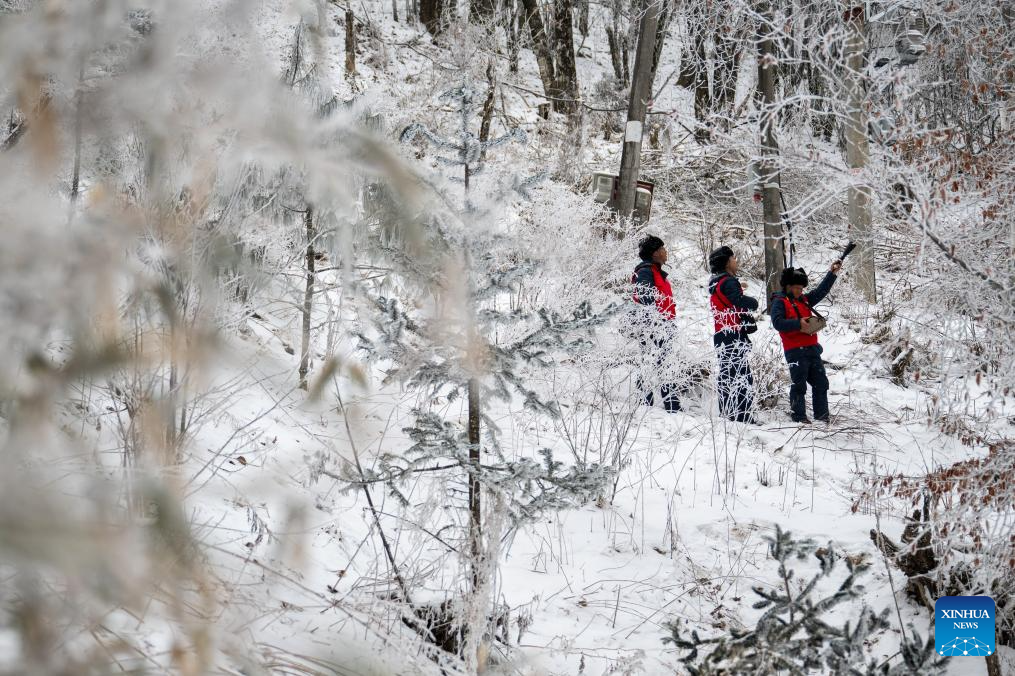 Workers patrol for power supply problems in Muyu Town, Shennongjia Forestry District of central China's Hubei Province, Jan. 21, 2026. Facing widespread low-temperature with severe icing on power lines in some high-altitude areas in Hubei Province, power maintenance staff conducted patrols to ensure the stable operation of the power grid. (Xinhua/Du Zixuan)