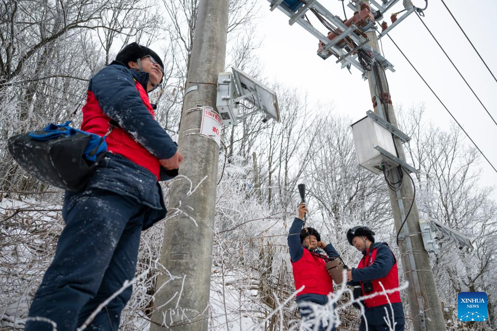 Workers check power facilities in Muyu Town, Shennongjia Forestry District of central China's Hubei Province, Jan. 21, 2026. Facing widespread low-temperature with severe icing on power lines in some high-altitude areas in Hubei Province, power maintenance staff conducted patrols to ensure the stable operation of the power grid. (Xinhua/Wu Zhizun)