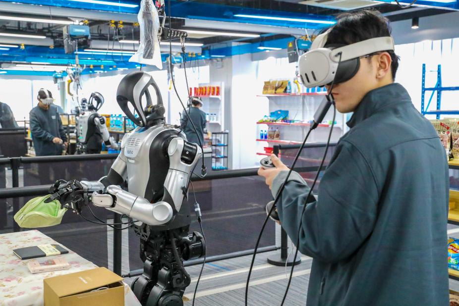 A humanoid robot puts stationery into a pencil case at a data collection and training ground for humanoid robots in Qingdao, east China's Shandong province. (Photo/Zhang Jingang)