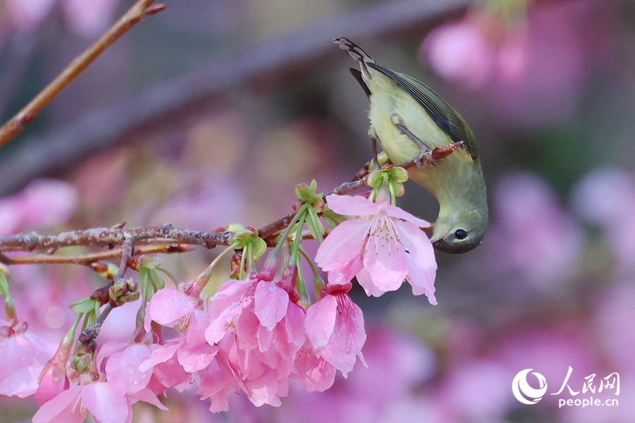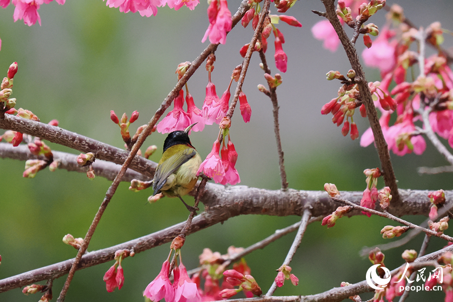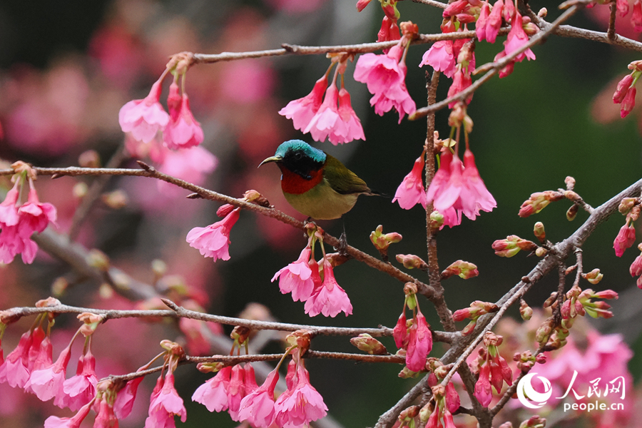 A fork-tailed sunbird feeds among cherry blossoms at Lianhua national forest park in Xiamen, southeast China's Fujian Province. (People's Daily Online/Chen Bo)