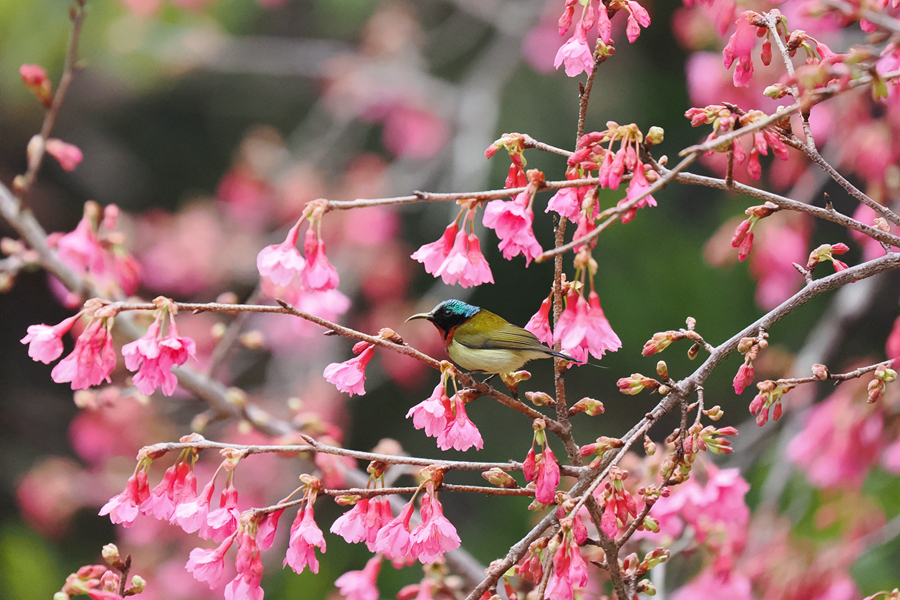 A fork-tailed sunbird perches among cherry blossoms at Lianhua national forest park in Xiamen, southeast China's Fujian Province. (Photo by Chen Qiaoyi)