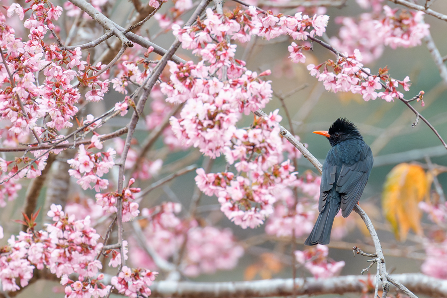 A black bulbul is seen atop a cherry tree at Lianhua national forest park in Xiamen, southeast China's Fujian Province. (Photo by Le Weilin)