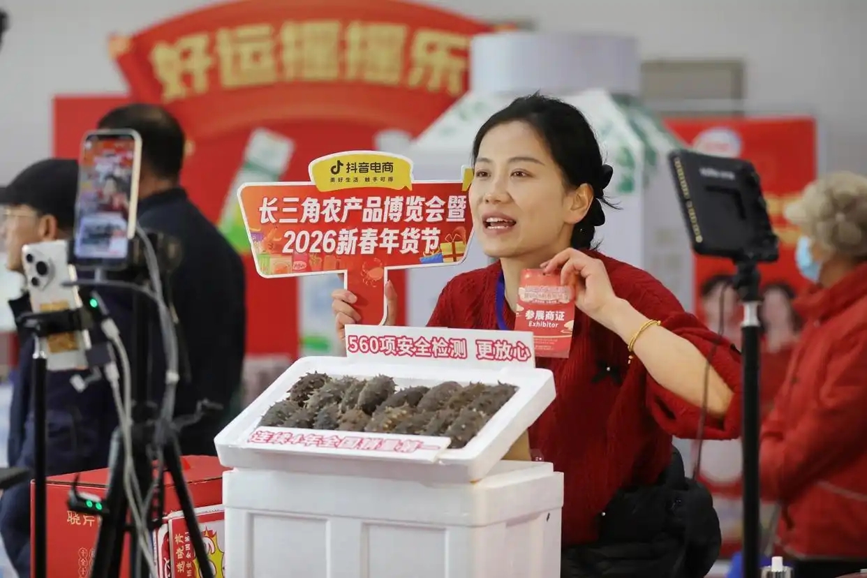 A livestreamer promotes Chinese New Year goods at the Yangtze River Delta agricultural products expo and the 2026 Chinese New Year Shopping Festival held at Jiaxing International Convention & Exhibition Center in Jiaxing, east China's Zhejiang Province on Jan. 24, 2026. (Photo/Workers' Daily)