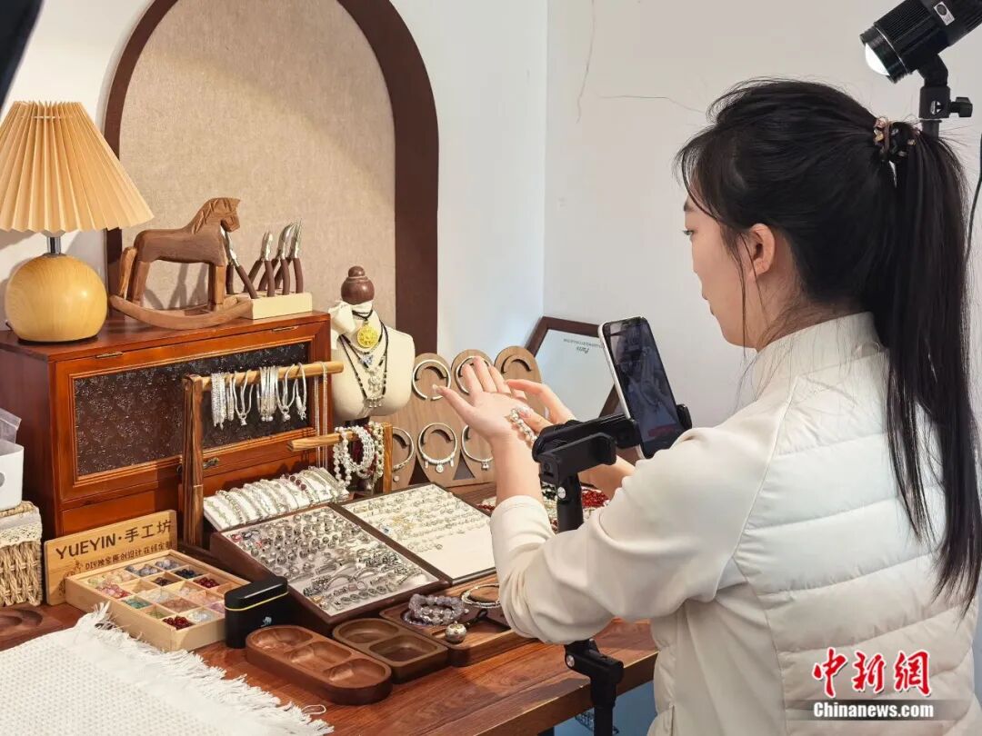 Livestreaming host Cui Xuepiao skillfully showcases silver jewelry in front of the camera. A returning entrepreneur and one of the park's standout livestreaming hosts, she noted that sales during a single livestreaming session held during last year's Qixi Festival (Chinese Valentine's Day in August) surpassed 4 million yuan.