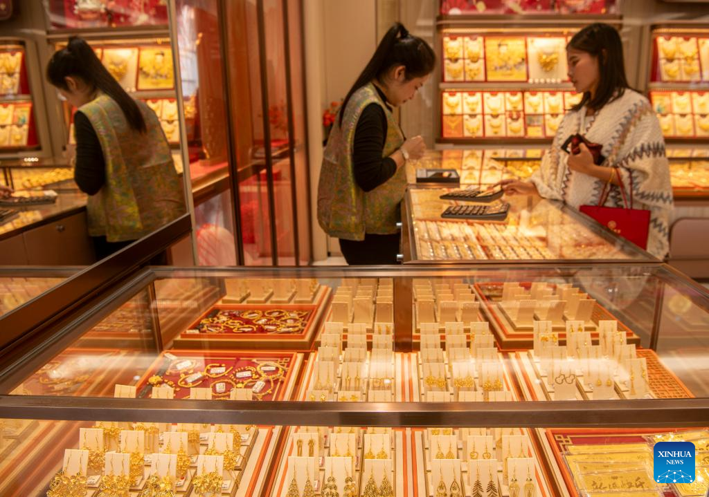 A customer selects gold accessories at a gold shop in Qionghai city of south China's Hainan Province, Jan. 29, 2026. (Photo by Meng Zhongde/Xinhua)