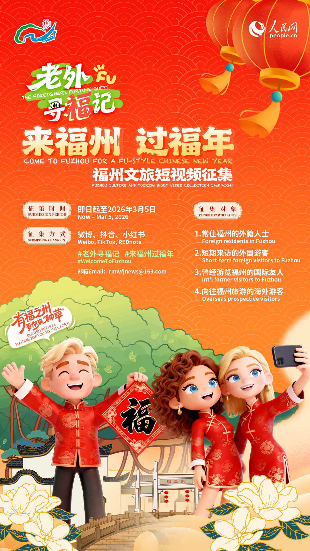The Fuzhou Municipal Bureau of Culture and Tourism, in partnership with People's Daily Online, is inviting creators worldwide to take part in the short-video collection campaign "Come to Fuzhou for a Fu-style Chinese New Year." The campaign runs until March 5.