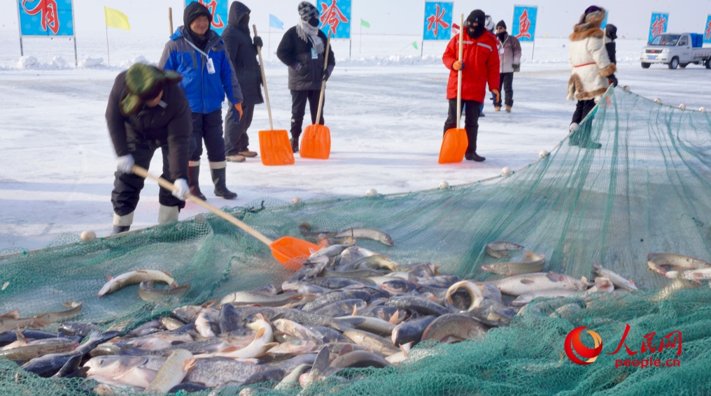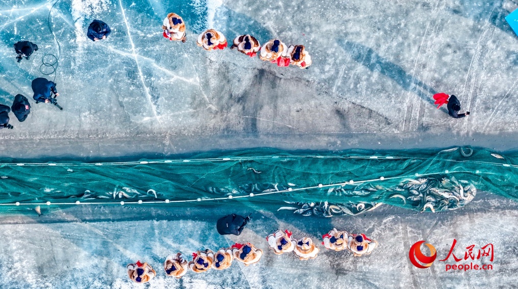 A large net full of fish is hauled across the frozen surface of Ulungur Lake in Fuhai county, Altay, northwest China's Xinjiang Uygur Autonomous Region. (People's Daily Online/Li Long)
