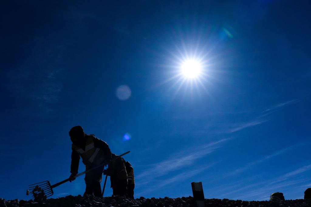 Staff members of the Wangkun Line maintenance workshop in Golmud section under China Railway Qinghai-Xizang Group Co., Ltd. maintain the rail along the Qinghai-Xizang Railway in northwest China's Qinghai Province, Feb. 6, 2026. (Xinhua/Zhang Long)