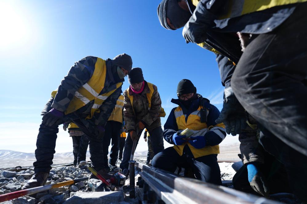 Staff members of the Wangkun Line maintenance workshop in Golmud section under China Railway Qinghai-Xizang Group Co., Ltd. maintain the rail along the Qinghai-Xizang Railway in northwest China's Qinghai Province, Feb. 6, 2026. (Xinhua/Qi Zhiyue)