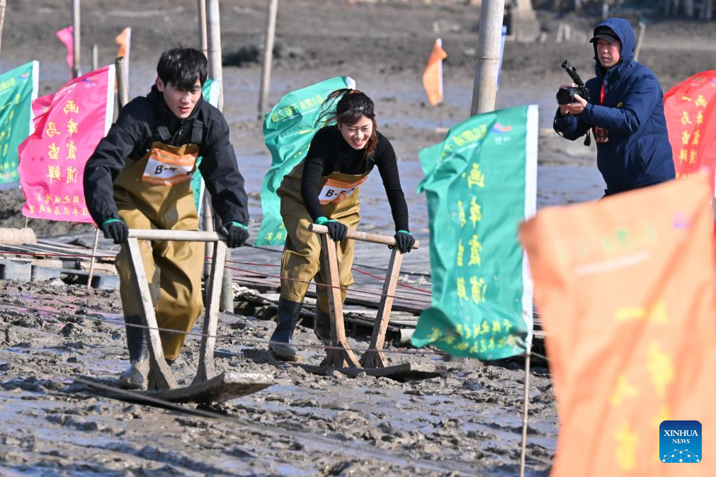 People attend a "munima" racing competition in Xiapu County, southeast China's Fujian Province, Feb. 8, 2026. "Munima," meaning "wooden mud horse" in Chinese, is a traditional sled-like tool for gliding over tidal flats to pick up seafood. Horse-themed tourism has surged recently in Xiapu County as the lunar Year of the Horse approaches. (Xinhua/Jiang Kehong)