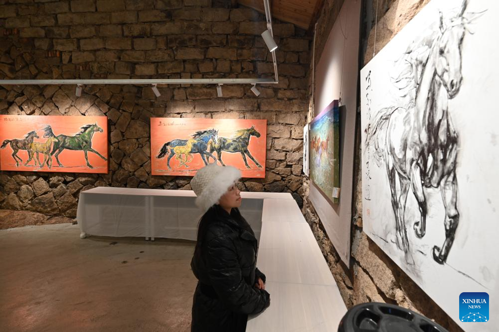 A tourist visits an art exhibition featuring horse elements in Xiapu County, southeast China's Fujian Province, Feb. 7, 2026. Horse-themed tourism has surged recently in Xiapu County as the lunar Year of the Horse approaches. (Xinhua/Jiang Kehong)