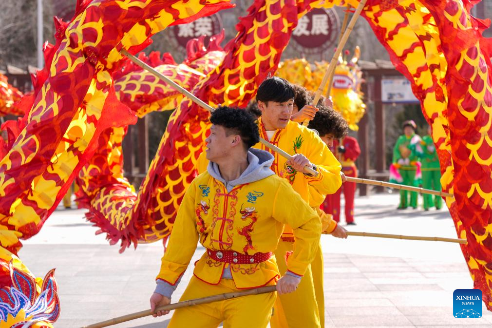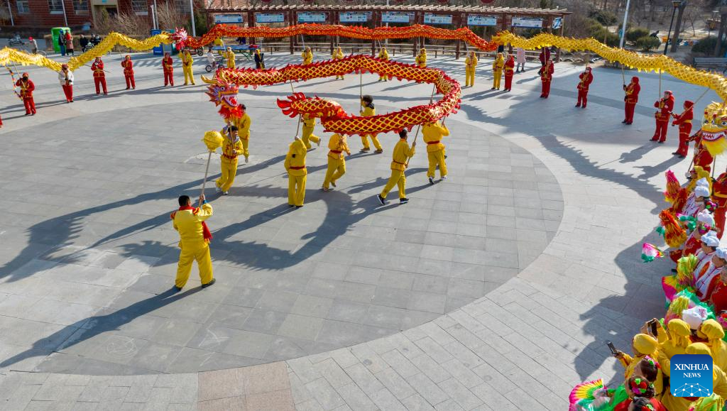 An aerial drone photo shows international students of North Minzu University experiencing dragon dance with local residents in Yinchuan, northwest China's Ningxia Hui Autonomous Region, Feb. 5, 2026. As the Spring Festival approaches, international students from North Minzu University were invited to a community in Yinchuan to experience traditional Chinese folk customs and share the festive joy of the Chinese New Year with local residents. (Xinhua/Yang Zhisen)