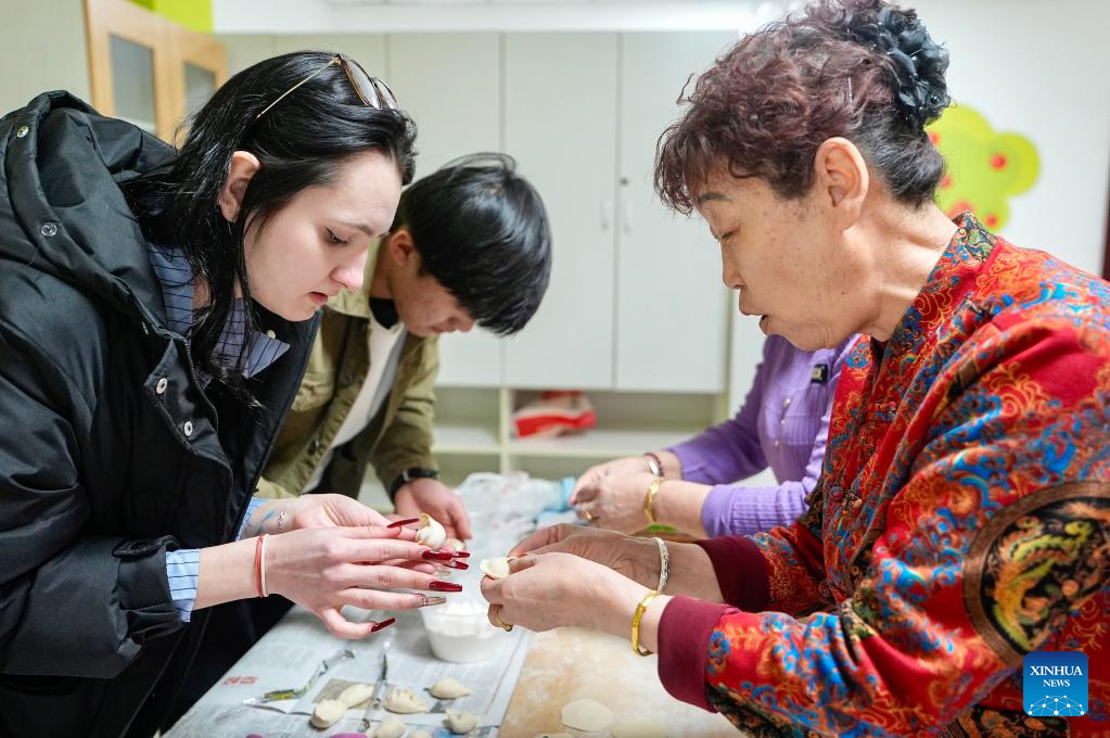 International students of North Minzu University make dumplings together with local residents in Yinchuan, northwest China's Ningxia Hui Autonomous Region, Feb. 5, 2026. As the Spring Festival approaches, international students from North Minzu University were invited to a community in Yinchuan to experience traditional Chinese folk customs and share the festive joy of the Chinese New Year with local residents. (Xinhua/Yang Zhisen)