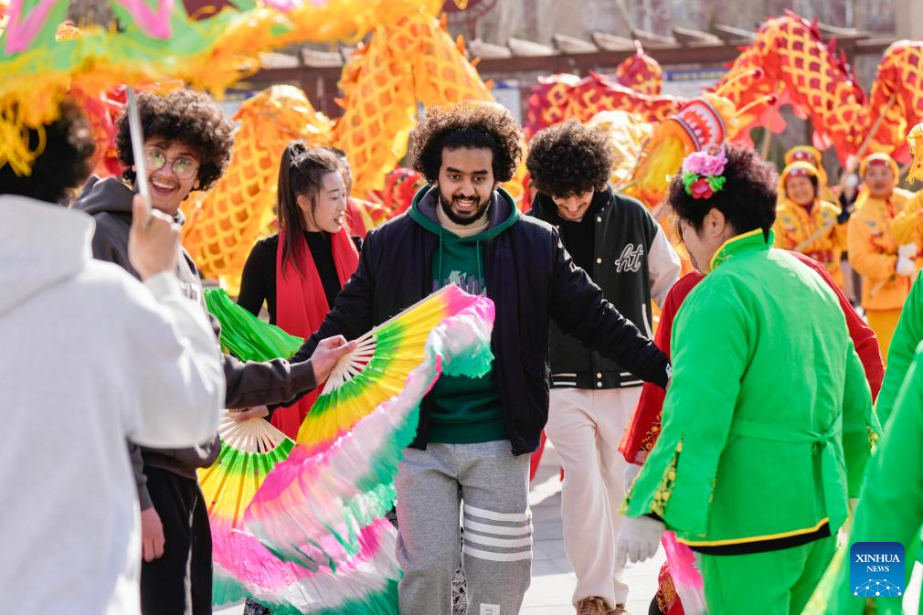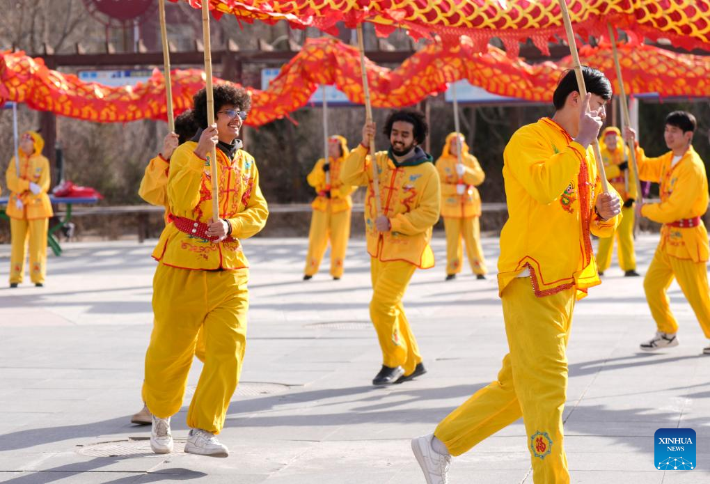 International students of North Minzu University experience dragon dance in Yinchuan, northwest China's Ningxia Hui Autonomous Region, Feb. 5, 2026. As the Spring Festival approaches, international students from North Minzu University were invited to a community in Yinchuan to experience traditional Chinese folk customs and share the festive joy of the Chinese New Year with local residents. (Xinhua/Yang Zhisen)