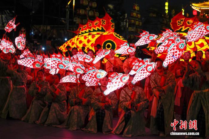 A Huizhou fish-shaped lantern performance draws crowds of tourists in Shexian county, Huangshan city, east China's Anhui Province, Jan. 1, 2026. (Photo/Shi Yalei)