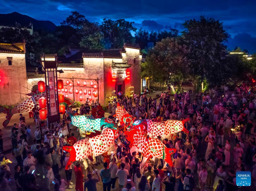 A drone photo taken on July 25, 2025, shows tourists watching a fish lantern parade in Chengkan village, Huizhou district of Huangshan city, east China's Anhui Province. (Xinhua/Fan Chengzhu)